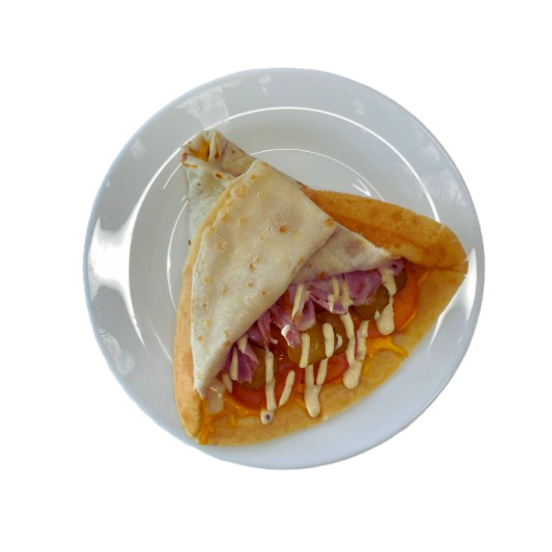 Вкуснейший блинчик приготовленный по особому рецепту с добавлением свежей начинки с сыром и беконом.