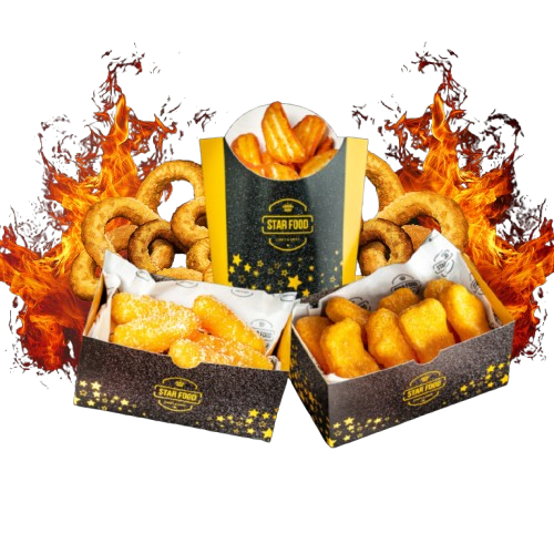 Луковые колечки фри, стрипсы, сырные монетки, картофель по деревенски